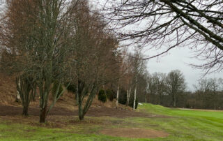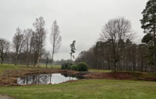 Under ett antal veckor har vi röjt och ”lyft” träden. Upplevelsen att bla kunna se från 6:e green till 7:e Fairways ger ett djup. Lyfta hela området kring 3:e green och 4:e tee. Och mer kommer… Bakom 9:an har vi mjukat av med kullar och grenat upp.